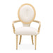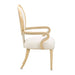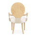AICO Furniture Camellia Field Arm Chair (Set of 2) in Caramel 9090004-134. With its graceful silhouette and thoughtfully crafted details, the Camellia Field Dining Arm Chair is a statement of refined comfort. The oval back, adorned with camellia marquetry, pairs beautifully with the warm pecan finish and antique gold accents. Upholstered in soft chenille, it combines luxurious materials with a supportive design, offering an inviting and sophisticated dining experience.
