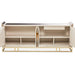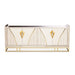 AICO Furniture Carmela Console Table in Shimmer Ivory LFR-CRMA223-141. Sophisticated textures and gleaming accents define the Carmella Console Cabinet, a statement piece that blends modern glamour with timeless elegance. The ivory-finished doors showcase a stunning mix of patterns and textures, framed by gold metal trims for a refined touch. A tinted mirrored glass top and mirrored trim enhance its luminous appeal, while the spacious storage interior offers both style and functionality.